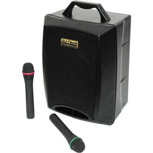 DJ-Tech is now introducing the complete PA system which is Fitting in one hand only : Visa 80. This Portable Sound solution have on board : a CD Player, 2 Wireless VHF or UHF microphone, a USB reader which reads MP3/WMA, a full section of Effects : Tone & Echo, a global mixer, and a Wired Microphone + Stero Line In/out. Do not forget the super amp section which is driven by 2 Long-lasting Rechargeable Battery for 10 hours of Fun. Play music anywhere !!! Coming with a Soft bag to put the 2 Wireless mics, all Cables and your best choice of CD Player, Visa 80 is your companion for all your musical trip, your conference's assistant , the perfect tool for Karaoke, the best partner for your Commercial, an incredible Boom Box for your party @ the beach :just connect your guitar and sing with your MP3 background music for accompaniment. School, Church, Seminar, or simply a Party machine, Visa 80 is the Swiss Knife for Public address.DJTECH VISA80 80-Watt Power Amplifier Specification